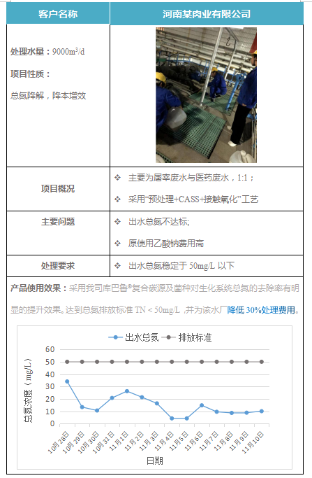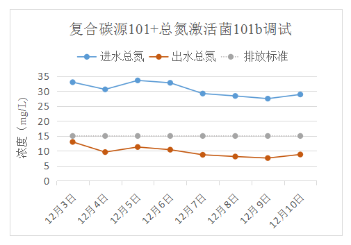 技術(shù)方案:在不改變水站原有設(shè)施的條件下,采用生化系統(tǒng)菌群優(yōu)化及針對性營養(yǎng)素組合的方案,使用我司復(fù)合碳源101b與總氮激活菌101,將系統(tǒng)出水總氮穩(wěn)定降至15 mg/L以下。